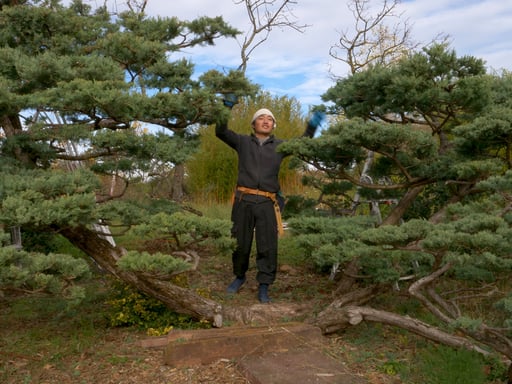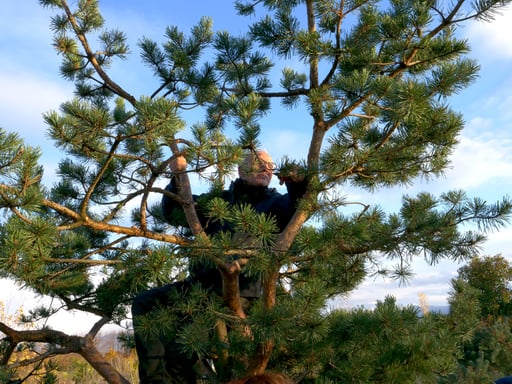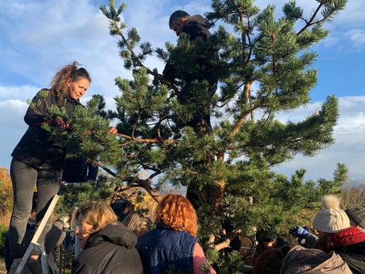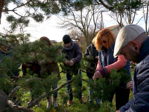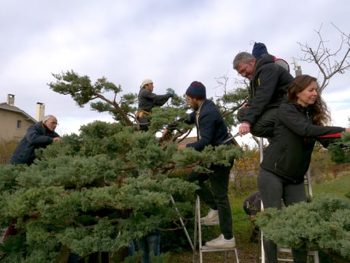 En matinée, les participant(e)s ont eu l’occasion d'approfondir les notions déjà abordées sur la taille naturelle, en s'exerçant sur le grand Junipérus de l'entrée. Ce conifère dont le travail a débuté il y a de nombreuses années, arbore à présent une forme à la fois très naturelle et maîtrisée. De par sa grandeur qui permet de se tenir dessous et son positionnement, il est le gardien de ces lieux.