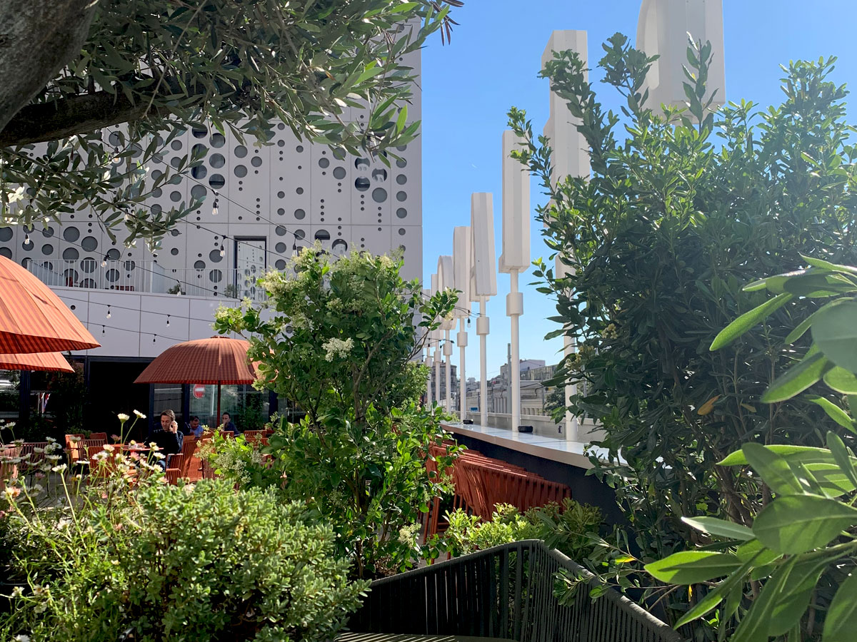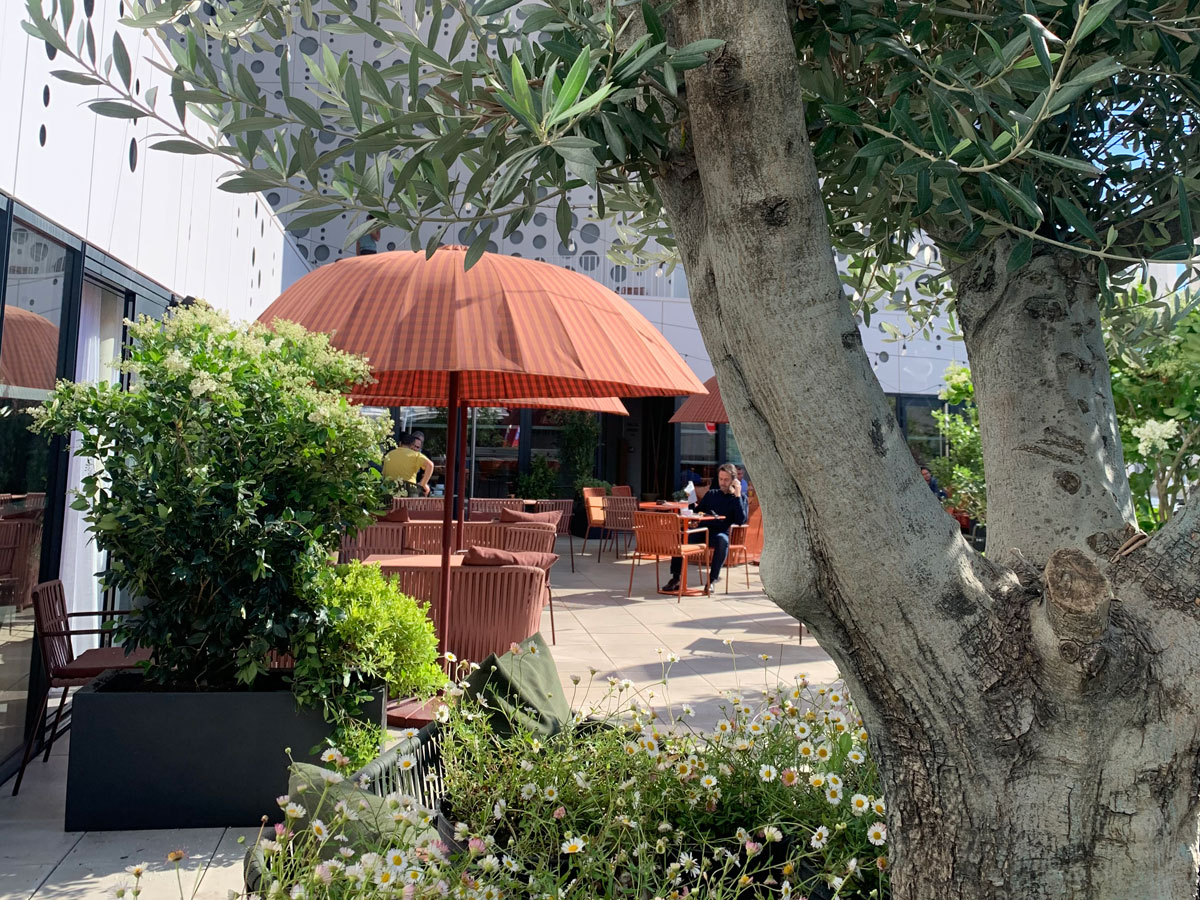 Nous avons été sollicités pour végétaliser la terrasse et la rendre plus intimiste. Nous avons fait de cet espace un véritable cocon végétal où les clients ont plaisir à prendre leur petit-déjeuner ou se détendre en soirée. Il s’agissait aussi d’apporter un peu de fraîcheur avec la présence des végétaux et de la brumisation, limitant ainsi les effets de la chaleur urbaine en période estivale.